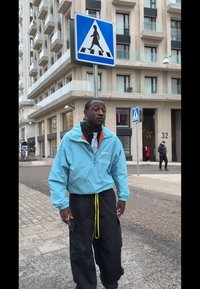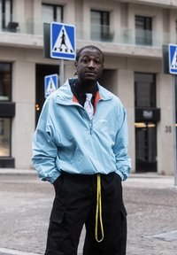 • Άνδρας που φοράει ανοιχτό μπλε αδιάβροχο και μαύρο cargo παντελόνι με κίτρινη κορδόνι στέκεται σε δρόμο της πόλης κοντά σε πινακίδες διάβασης πεζών.