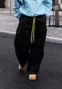 • Άτομο που περπατάει στον δρόμο φορώντας γαλάζιο μπουφάν, μαύρο φαρδύ παντελόνι cargo με μακρύ κίτρινο κορδόνι και καφέ μποτάκια.