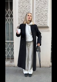 • Γυναίκα με ξανθά μαλλιά που φορά γυαλιά, γκρι φούτερ με κουκούλα και φόρμα, μαύρο μακρύ παλτό, κρατώντας ένα φλιτζάνι καφέ και μαύρη τσάντ�α, στέκεται σε εξωτερικό χώρο.