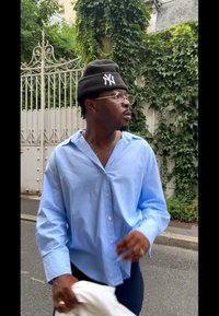 • Ανοιχτό μπλε πουκάμισο με κουμπιά, μαύρη σκούφη με λογότυπο, κρατάει λευκό ύφασμα, στέκεται κοντά σε διακοσμητική πύλη, φοράει γυαλιά και κοσμήματα.