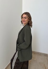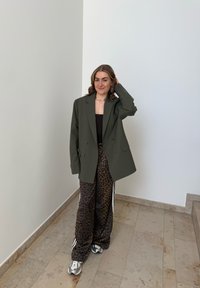 • Γυναίκα στέκεται μέσα, φορώντας oversized ελιά σακάκι, μαύρο τοπάκι, παντελόνι με λεοπάρ σχέδιο και ασημί αθλητικά, χαμογελώντας με το ένα χέρι να αγγίζει τα μαλλιά της.