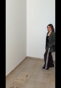 • Άτομο που φοράει φόρμα Adidas με λεοπάρ σχέδιο και ελαστική μέση, και γκρι σακάκι, με το χέρι στην τσέπη, στέκεται σε πλακάκια.