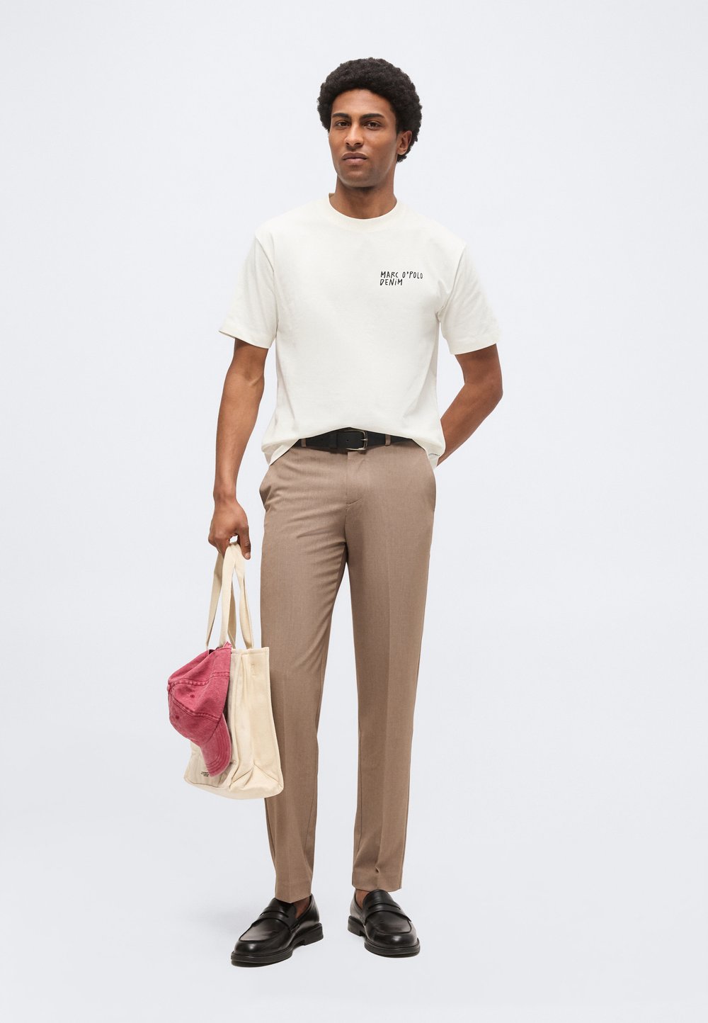 Μαύρο τζάκετ από τζιν, λευκό μπλουζάκι, μπεζ παντελόνι και λευκά sneakers. Το τζάκετ διαθέτει μπροστινές τσέπες και μεταλλικά κουμπιά, δημιουργώντας μια χαλαρή εμφάνιση.