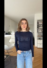• Νεαρή γυναίκα με σκούρο εφαρμοστό μπλουζάκι μακρυμάνικο και ανοιχτόχρωμο τζιν παντελόνι με φαρδιά πόδια, που στέκεται σε ένα μοντέρνο σαλόνι με ξύλινο πάτωμα.