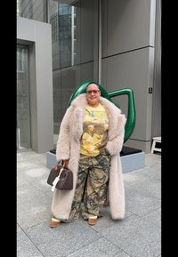 • Γυναίκα που χαμογελά φορώντας μεγάλο μπεζ παλτό από γούνα, κίτρινη γραφική μπλούζα, παντελόνι καμουφλάζ και �γυαλιά ηλίου, κρατώντας ένα καφέ δερμάτινο τσάντα σχεδιαστή σε εξωτερικό χώρο.