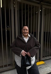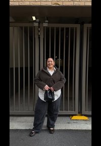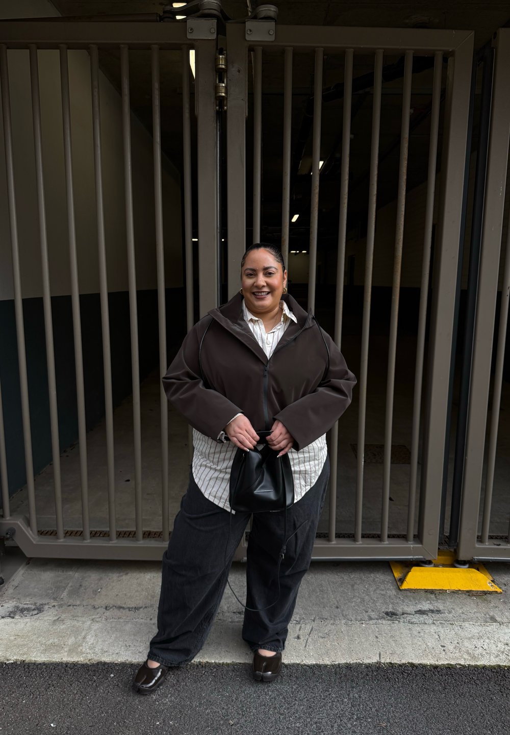• Μια γυναίκα που χαμογελά στέκεται μπροστά από μια μεγάλη γκρι μεταλλική πύλη, φορώντας καφέ μπουφάν, ριγέ πουκάμισο, μαύρο παντελόνι και κρατώντας μια μαύρη τσάντα.
