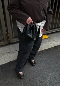 • Άτομο που φοράει σκούρο παντελόνι, καφέ μπουφάν και ριγέ πουκάμισο κρατάει μια μικρή μαύρη δερμάτινη τσάντα κοντά σε μεταλλική πύλη πάνω σε τσιμεντένιο πεζοδρόμιο.
