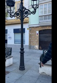Λευκά παντελόνια σε φαρδιά γραμμή, μαύρο σακάκι και ένα σκούρο κασκόλ. Φοράει ακουστικά και δαχτυλίδια, στέκεται δίπλα σε έναν στύλο του δρόμου με περαστικούς και μια βαν κοντά.