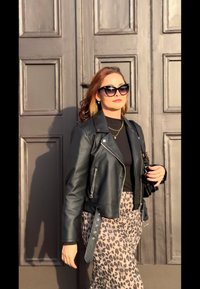 • Μαύρη δερμάτινη τζάκετ μοτοσικλετιστή πάνω από ένα μαύρο ραμμένο τοπ, συνδυασμένο με μια μπεζ φούστα με λεοπαρντί σχέδιο. Φυσικός ήλιος αναδεικνύει την υφή.