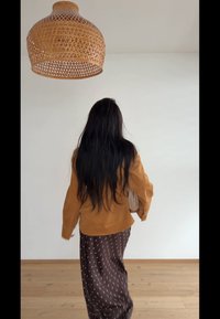 • Γυναίκα με μακριά σκούρα μαλλιά που κρατάει μπεζ τσάντα, φοράει καφέ πουκάμισο από κορντόρι και σκουρόχρωμη καφέ φούστα με πουά, στέκεται σε ξύλινο πάτωμα κάτω απ�ό πλεκτό φωτιστικό.