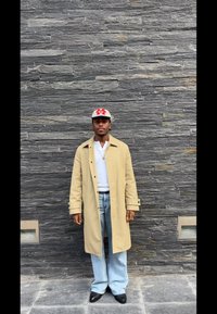 • Άνδρας που φοράει μπεζ παλτό τύπου trench, άσπρο πουκάμισο, ανοιχτό μπλε τζιν, μαύρα παπούτσια, γυαλιά και άσπρο καπέλο, στεκόμενος μπροστά σε σκούρο γκρι πέτρινο τοίχο.
