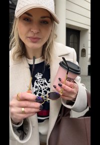 Μπεζ και μαύρο παλτό, γυαλιστερά μαύρα μανίκια, με ζώνη στη μέση, συνδυασμένο με μαύρο παντελόνι και παπούτσια. Κρατάει ένα φλιτζάνι καφέ, στέκεται δίπλα σε τοίχο από τούβλα.