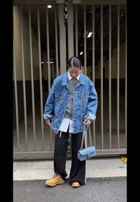 • Νεαρό άτομο που φοράει υπερμεγέθη τζιν μπουφάν και γκρι πουλόβερ, κρατώντας μια μπλε τσάντα με καπιτονέ σχέδιο, στέκεται μπροστά από κάθετες μεταλλικές μπάρες.