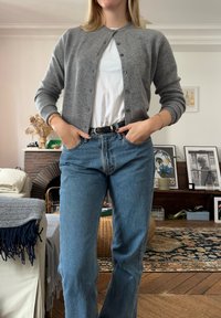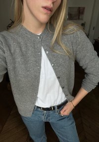 • Γκρίζα, πλεκτή καρντιγκάν με στρογγυλή λαιμόκοψη, με κουμπιά μπροστά, φορεμένη πάνω από λευκό t-shirt. Συνδυασμένη με ανοιχτόχρωμα μπλε τζιν και μαύρη ζώνη.