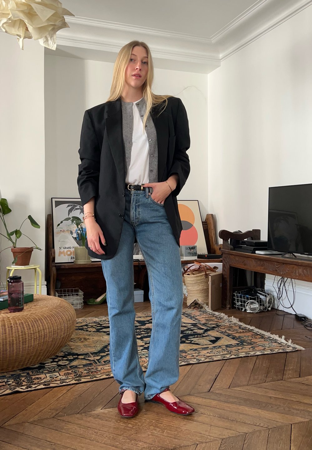 • Μαύρη oversized σακάκι πάνω από γκρίζο πουλόβερ και λευκό πουκάμισο, σε συνδυασμό με μπλε τζιν και κόκκινες μπαλαρίνες, σε οικιακό περιβάλλον.
