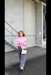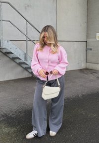 • Ξανθιά γυναίκα με ροζ πουλόβερ, γκρι παντελόνι φαρδιάς γραμμής και λευκά αθλητικά παπούτσια κρατάει λευκή τσάντα και γυαλιά ηλίου δίπλα σε σκάλες από σκυρόδεμα.
