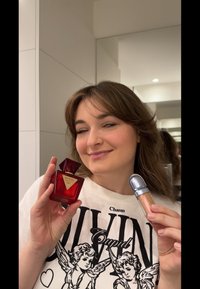 • Σετ αρώματος KIKO με τρεις φιάλες από διαφανές γυαλί και χρυσές λεπτομέρειες, που περιέχει μία ροζ φιάλη. Το μοντέλο κρατά το σετ και δείχνει μία φιάλη.