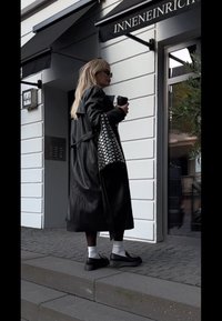 • Μαύρο δερμάτινο μακρύ παλτό, μαύρο και λευκό ριγέ πουλόβερ, κοντή φούστα, μαύρες πλατφόρμες loafers και τσάντα με καρφιά. Υπαίθριο περιβάλλον.