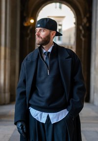 • Άνδρας με μούσι, φοράει μαύρο καπέλο, παλτό, γάντια και γραβάτα, στέκεται σε μια αψιδωτή διάδρομο, κοιτάζοντας προς τα αριστερά με τα χέρια στις τσέπες.