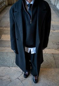 • Άτομο που φοράει μαύρο παλτό, μαύρο ζιπ-τουρλ, λευκό πουκάμισο, μαύρο παντελόνι, γάντια και μαύρα παπούτσια, στέκεται σε πλακόστρωτο πεζοδρόμιο.