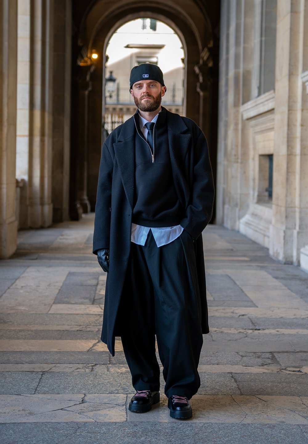 Άνδρας με γένια, φοράει μαύρο παλτό, μαύρο πουκάμισο, μπλε τζιν και μαύρα αθλητικά παπούτσια, στέκεται πάνω σε λιθόστρωτο πεζοδρόμιο κοντά σε ένα κλασικό κτίριο.