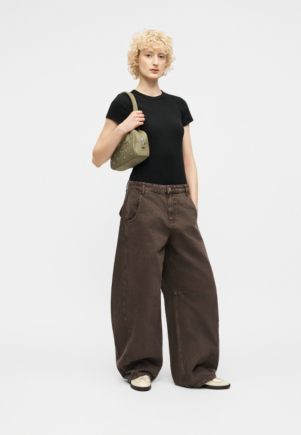Γυναίκα με μακριά καστανά μαλλιά που φοράει σκούρα γυαλιά ηλίου, καφέ πουλόβερ, ανοιχτό μπλε φαρδιά τζιν, μαύρα αθλητικά παπούτσια, κρατώντας μια σκούρα μωβ τσάντα.