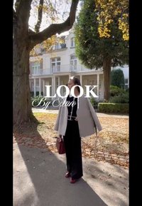 • Μαύρο και λευκό πουκάμισο με γιακά, σε συνδυασμό με φαρδιά μαύρα παντελόνια. Γκρι κάπα ριγμένη στους ώμους και ένα μπορντό τσάντα.