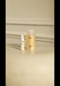 • Ριγέ, υπερμεγέθης γκρι σακάκι και παντελόνι με φαρδιές μπατζάκια, φορεμένα μπροστά σε μια υφιστάμενη τοιχοποιία με κλασικούς κίονες και ξύλινη πόρτα.