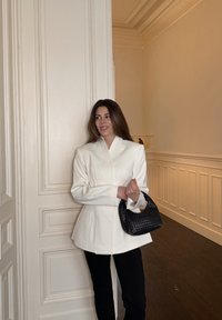 • Γυναίκα με λευκό σακάκι και μαύρο παντελόνι, κρατώντας μια μαύρη πλεκτή τσάντα, στέκεται μπροστά από μια λευκή πόρτα με πάνελ σε ένα μπεζ δωμάτιο.