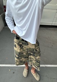 • Άτομο με μακρυμάνικο λευκό πουκάμισο, cargos σορτς με καμουφλάζ μοτίβο και μπεζ παπούτσια slip-on στέκεται σε πλακόστρωτη επιφάνεια.