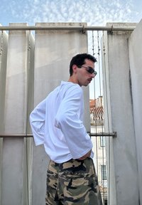 • Νέος άνδρας με γυαλιά ηλίου, λευκό μακρυμάνικο πουκάμισο και παντελόνι παραλλαγής στέκεται με τα χέρια στη μέση μπροστά σε τσιμεντένιο τοίχο με μεταλλικά κάγκελα.