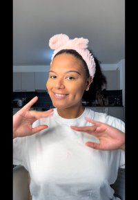 • Κοντινό πλάνο ενός προσώπου με ανοιχτό καφέ μαλλί, πράσινα μάτια, ένα χρυσό ρινικό σκουλαρίκι σε σχήμα καρδιάς και μεγάλα σπειρωτά χρυσά σκουλαρίκια. Το δέρμα έχει φακίδες.