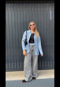 • Ανοιχτό μπλε oversized πουκάμισο, μαύρο crop top, γκρι φαρδιά τζιν παντελόνια και μαύρα αθλητικά παπούτσια με σόλα από γόμα. Μαύρη τσάντα και γυαλιά ηλίου ως αξεσουάρ.
