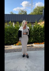 • Δίχρωμο σε μαύρο και άσπρο πλεκτό σετ δύο κομματιών με cropped τοπ και μακριά φούστα, συνδυασμένο με μια ζακέτα σε μαύρο και κρεμ χρώμα.