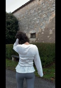 • Λευκή μπλούζα με μακριά μανίκια και πτυχώσεις στη μέση, συνδυασμένη με στενές γκρι παντελόνες. Στο φόντο διακρίνεται μια φράχτη και ένας τοίχος από πέτρα.