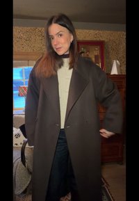 • Γυναίκα με μακριά καστανά μαλλιά που φοράει σκούρο παλτό πάνω από εκρού πλεκτό πουλόβερ, κρατώντας τα πέτα του παλτού με τα δύο χέρια μέσα σε κτήριο κοντά σε παράθυρο.