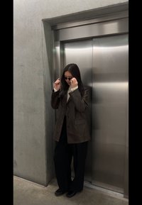 • Γυναίκα με γυαλιά ηλίου, καφέ δερμάτινο μπουφάν, λευκό ζιβάγκο και μαύρο παντελόνι με φαρδιά μπατζάκια στέκεται μπροστά από κλειστές μεταλλικές πόρτες ανελκυστήρα.