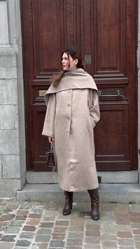 • Άτομο που φοράει μακρύ παλτό σε μπεζ χρώμα, σκούρα καφέ μπότες με τακούνι, κρατώντας μια τσάντα χειρός σε σκούρο καφέ χρώμα, στέκεται μπροστά από μια ξύλινη πόρτα σε πλακόστρωτο.