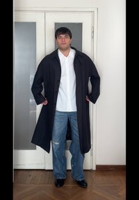 • Άτομο με μαύρο μακρύ παλτό πάνω από λευκό πουκάμισο και μπλε τζιν, με τα χέρια στις τσέπες του παλτού, στέκεται σε επιφάνεια από πέτρα και άσφαλτο.