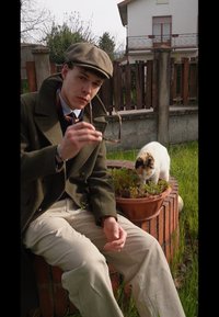 • Ένας νεαρός άνδρας με ελιά πράσινο παλτό και καπέλο επίπεδο κάθεται δίπλα σε μια γλάστα με λουλούδια. Μια λευκή γάτα με μαύρες λεπτομέρειες �πλησιάζει, περιτριγυρισμένη από γρασίδι.