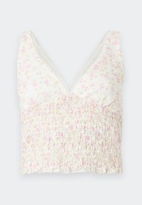 Γυναίκα με λευκό τοπ με μοτίβα τύπου halter και φαρδιά παντελόνα στέκεται σε εσωτερικό χώρο με αιωρούμενες κρεμ κουρτίνες και τροπικά φυτά στο φόντο.