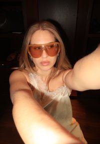 • Νεαρή γυναίκα με μεγάλα πορτοκαλί γυαλιά ηλίου και μπεζ τοπ με δαντέλα, που απλώνει και τα δύο χέρια μπροστά.