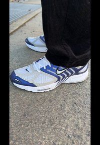 • Λευκά και ναυτικά μπλε αθλητικά πα�πούτσια Nike με πλέγμα, εμφανή μαύρη φτέρνα και υφασμάτινη σόλα. Φορεμένα με μαύρα παντελόνια από χοντρό βελούδο.
