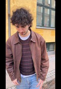 • Νεαρός με σγουρά μαλλιά φοράει καφέ δερμάτινο μπουφάν, σκούνο πουλόβερ και μπλε τζιν, στέκεται σε πεζοδρόμιο με κυβόλιθους δίπλα σε κίτρινο κτίριο.
