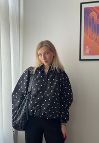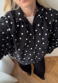 Γυναίκα με ξανθά μαλλιά που φοράει μαύρο μπουφάν με πουά, λευκό πουκάμισο, φαρδιά μπλε τζιν, μαύρα παπούτσια, κρατώντας μαύρη τσάντα, στέκεται μέσα κοντά σε παράθυρο.