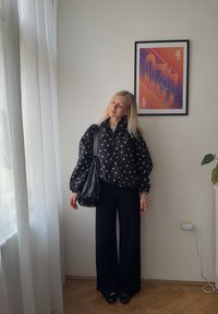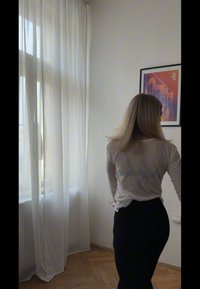 • Γυναίκα με μακριά ξανθά μαλλιά, που φοράει μαύρο πουκάμισο με πουά και φαρδιά μαύρα παντελόνια, στέκεται κοντά σε ένα παράθυρο με μια πολύχρωμη κορνιζαρισμένη αφίσα στον τοίχο.