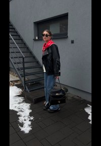 • Γυναίκα που φοράει μαύρο δερμάτινο μπουφάν, κόκκινο κασκόλ, άσπρο πουλόβερ, γυαλιά ηλίου και μπλε τζιν στέκεται κοντά σε εξωτερικές μεταλλικές σκάλες δίπλα σε γκρίζο τοίχο.