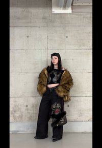 • Νεαρή γυναίκα με γούνινο μπουφάν, μαύρο crop top, παντελόνια φαρδιά με τριαντάφυλλο κεντημένο, δερμάτινο καπέλο και κρατώντας μια μαύρη γούνινη τσάντα.