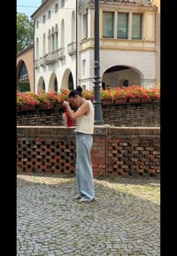 • Ανοιχτό μπεζ πλεκτό τοπ, ανοιχτό μπλε παντελόνι με φαρδιές γραμμές και μια λουλουδάτη τσάντα πλάτης. Στέκεται ανάμεσα σε δύο πέτρινες κολώνες με υφές στους τοίχους πίσω.