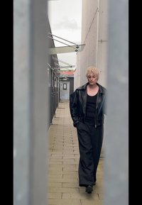 • Μαύρο δερμάτινο μπουφάν με καπέλο με φαρδύ γείσο, μαύρο καρέ V και φαρδιά μαύρα παντελόνια. Μεταλλικό κράσπεδο και συννεφιασμένος ουρανός στο φόντο.